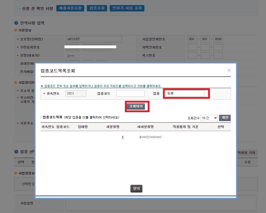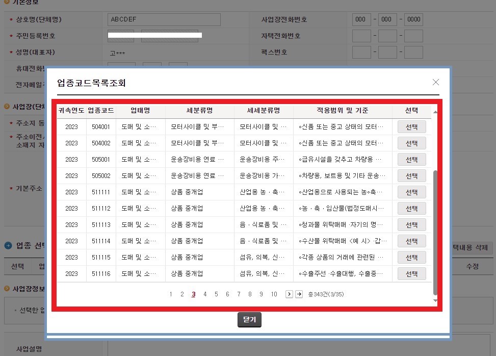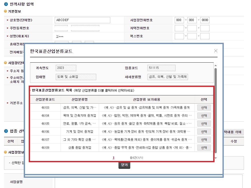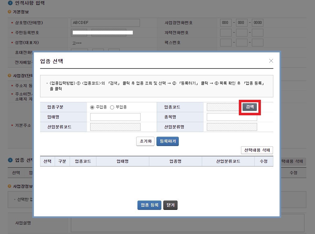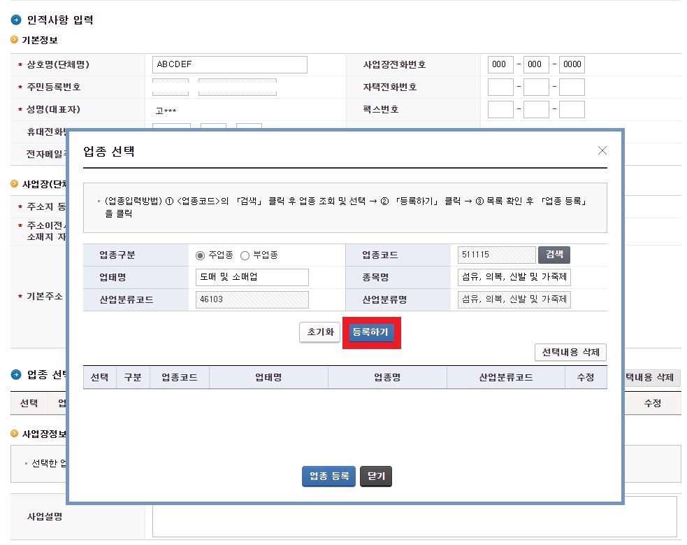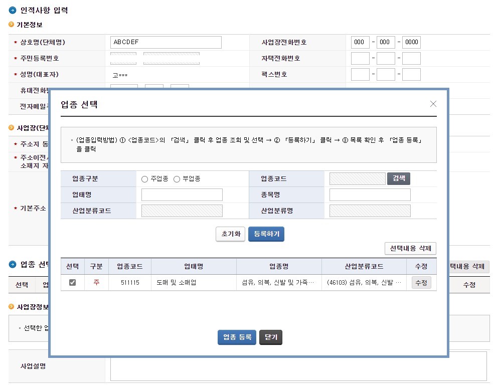 내가 운영할 사업장의 맞는 코드를 잘 찾아서 선택해주세요~ 주업종을 입력후 부업종은 원하시는 분야로 다시 추가할 수 있습니다. (예를들어 도소매 업을 주로 운영할거지만, 우리 업체는 디자인도 하고 제조도 한다 하고 하면 부업종으로 그에 맞는 업종을 추가로 선택해서 넣어주시면 됩니다.)