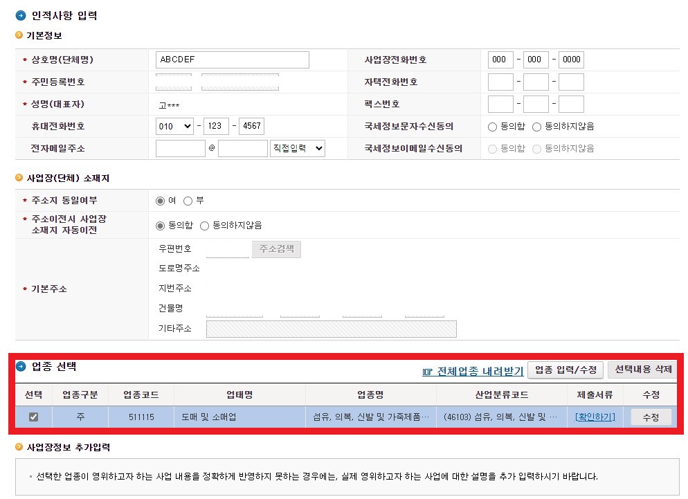상호명 주민등록번호,대표자 성명 등 앞에 빨간 별표 있는부분은 꼭 작성해주셔야 합니다.