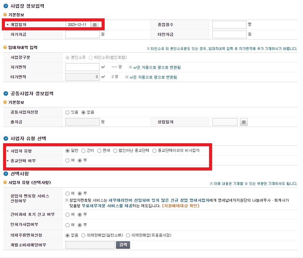 몇월몇일 개업을 했고 우리 사업장 규모에 대한 정보를 입력해 주시면 됩니다.