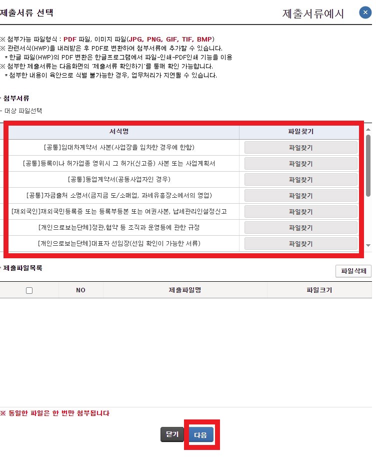 모든 부분 작성이 완료되셨다면 미리 준비하신 서류를 파일 업로드 해주시면 모든 과정이 마무리 된답니다.