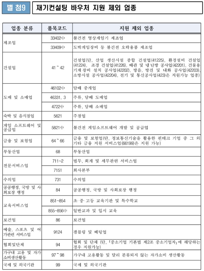 아래 별첨9 에 해당하는 업종을 영위하지않는 중소기업
